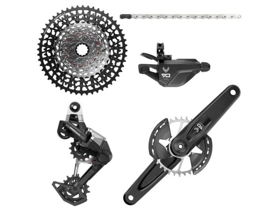 Mechanical shifting at it's best. Eagle 90 delivers the dream, and then some. Featuring the same Full Mount derailleur architecture as it's AXS Transmission siblings, it is unquestionably robust. And for the just in case, the derailleur body features replaceable outer and inner parallelogram links, skid plates, and a tool-free threaded cage assembly, making it the most rebuildable derailleur we've ever built. At the heart of the system is a sleek and sturdy forged aluminum DUB crankset, with a signature silver T-Type chainring equipped with removable bash guards. Shifting under load is a signature of Eagle Transmission, and this is made possible on 90 with an XS-1275 T-Type cassette that features full X-Sync technology, and a premium double-click T-Type Actuation mechanical shifter. For those inclined to DIY, mechanical Eagle Trans-mission has a revolutionary simple four step setup procedure: Prepare. Hang. Tighten. Route. Featuring no limit screws, no b-tension, and no guesswork. Built to take you as far as your imagination and body will allow, Eagle 90 Transmission provides riders with an unparalleled ride experience. - Hangerless Interface (UDH) frame compatibility only - Distinct black and silver finish - Available with 165mm, 170mm, 175mm DUB crankarms, and 32T T-Type chainring with two bash guards - Eagle 90 shift lever features stealth architecture, and MMX compatibility for seamless pairing with SRAM brakes. Cockpit tidying Shift Housing/Brake Hose clip included - Shift lever is built with modern shift ergonomics and a premium textured aluminum lever touchpoint - Black XS-1275 features 10-52t range and full X-SYNC technology for best inboard and outboard shifting performance under load - Full Mount Eagle 90 derailleur is the most rebuildable Eagle Transmission derailleur, with replaceable B-Knuckle, Inner/Outer Links, Bash Guards, Bushings, Cage, and Cage Assembly - Includes GX Eagle Transmission Flattop chain